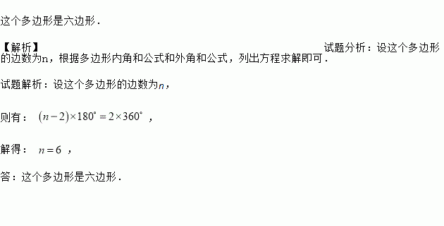 这个多边形是六边形. 【解析】试题分析:设这个多边形的边数为n,根据多边形内角和公式和外角和公式,列出方程求解即可. 试题解析:设这个多边形的边数为n, 则有: , 解得: , 答:这个多边形是六边形.
