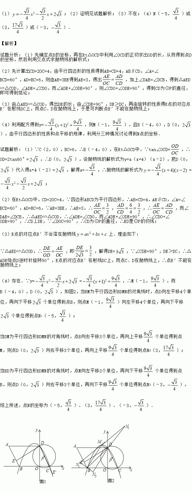 (1);(2)证明见试题解析;(3)不在;(4)N(﹣5,)或(3,)或(﹣3,). 【解析】 试题分析:(1)先确定点B的坐标,再在Rt△OCD中利用∠OCD的正切求出OD的长,从而得到点D的坐标,然后利用交点式求抛物线的解析式; (2)先计算出CD=2OC=4,由平行四边形的性质得到AB=CD=4,AB∥CD,∠A=∠BCD=60°,AD=BC=6,则由AE=3BE得到AE=...