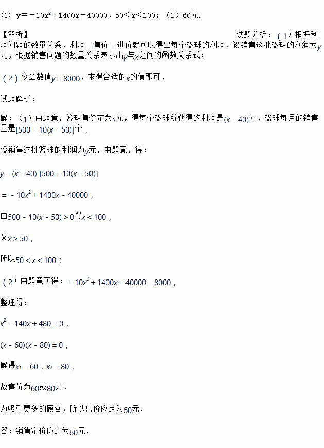 某超市购进一种单价为40元的篮球,如果以单价50元出售,那么每月可售出500个,根据销售经验,售价每提高1元,销售量相应减少10个.如果超市将篮球售价定为x元(x>50),每月销售这种篮球获利y元.