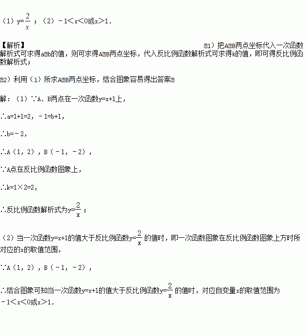 (2)当一次函数y=x+1的值大于反比例函数y=