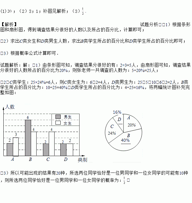 (3)为了共同进步,李老师想从被调查的A类和D类学生中各随机选取一位同学进行“一帮一”互助学习,请用列表法或画树形图的方法求出所选两位同学恰好是一位男同学和一位女同学的概率.