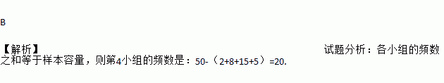 B 【解析】试题分析:各小组的频数之和等于样本容量,则第4小组的频数是:50-(2+8+15+5)=20.