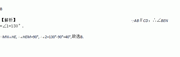 如图:AB∥CD,直线MN与AB交于E,过点E作直线HE⊥MN,∠1=130°,则∠2等于( )