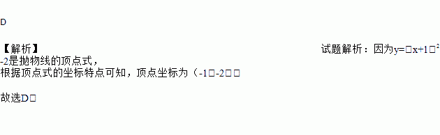 D 【解析】试题解析:因为y=(x+1)2-2是抛物线的顶点式, 根据顶点式的坐标特点可知,顶点坐标为(-1,-2). 故选D.