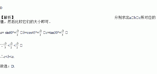 若a=sin60°,b=cos45°,c=tan30°,则它们之间的大小关系是( )