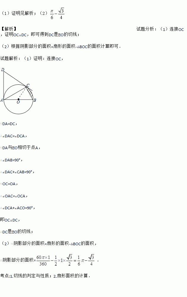 (1)证明见解析;(2) 【解析】试题分析:(1)连接OC,证明OC⊥DC,即可得到DC是⊙O的切线; (2)根据阴影部分的面积=扇形的面积-△BOC的面积计算即可. 试题解析:(1)证明:连接OC, ∵DA=DC, ∴∠DAC=∠DCA, ∵DA与⊙O相切于点A, ∴∠DAB=90°, ∴∠DAC+∠CAB=90°, ∵OC=OA, ∴...
