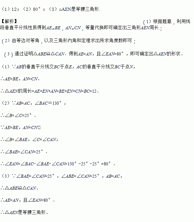 如图所示,在△ABC中,AB=AC,BC=12,∠BAC=130°,AB的垂直平分线交BC于点E,AC的垂直平分线交BC于点N.