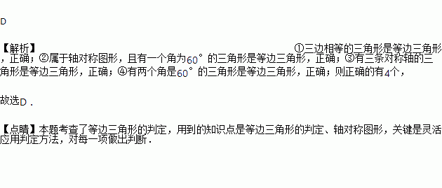 △ABC中,①若AB=BC=CA,则△ABC是等边三角形;②属于轴对称图形,且有一个角为60°的三角形是等边三角形;③有三条对称轴的三角形是等边三角形;④有两个角是60°的三角形是等边三角形,上述结论中正确的有( )