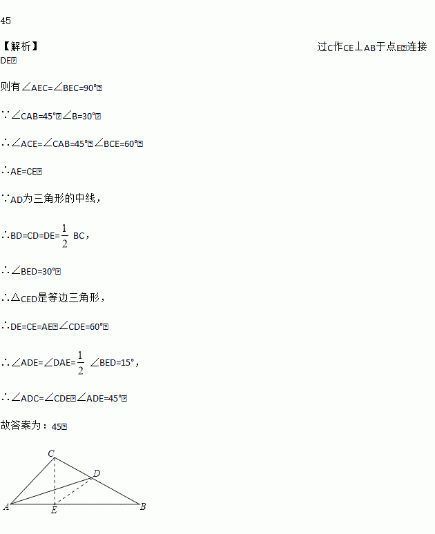 45 【解析】过C作CE⊥AB于点E,连接DE, 则有∠AEC=∠BEC=90°, ∵∠CAB=45°,∠B=30°, ∴∠ACE=∠CAB=45°,∠BCE=60°, ∴AE=CE, ∵AD为三角形的中线, ∴BD=CD=DE=BC, ∴∠BED=30°, ∴△CED是等边三角形, ∴DE=CE=AE,∠CDE=60°, ∴∠AD...