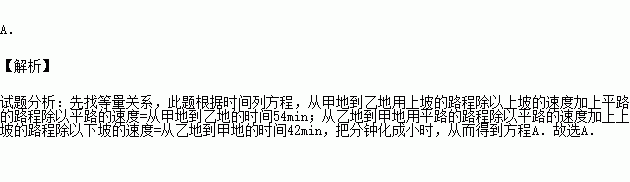 从甲地到乙地有一段上坡与一段平路.如果保持上坡每小时走3km, 平路每小时走4km,下坡每小时走5km,那么从甲地到乙地需54min, 从乙地到甲地需42min.设从甲地到乙地上坡与平路分别为xkm,ykm,依题意,所列方程组正确的是( ).