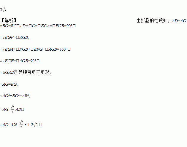 如图矩形ABCD中,AB=4 ,将角D与角C分别沿过A和B的直线AE、BF向内折叠,使点D、C重合于点G,∠EGF=∠AGB,则AD=________。