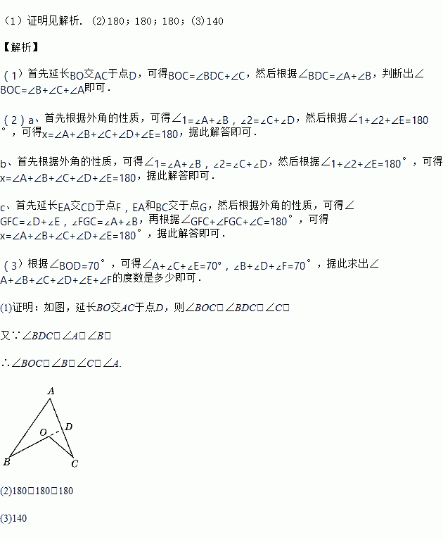 (3)如图③,一个六角星,其中∠BOD=70°,则∠A+∠B+∠C+∠D+∠E+∠F=________°.