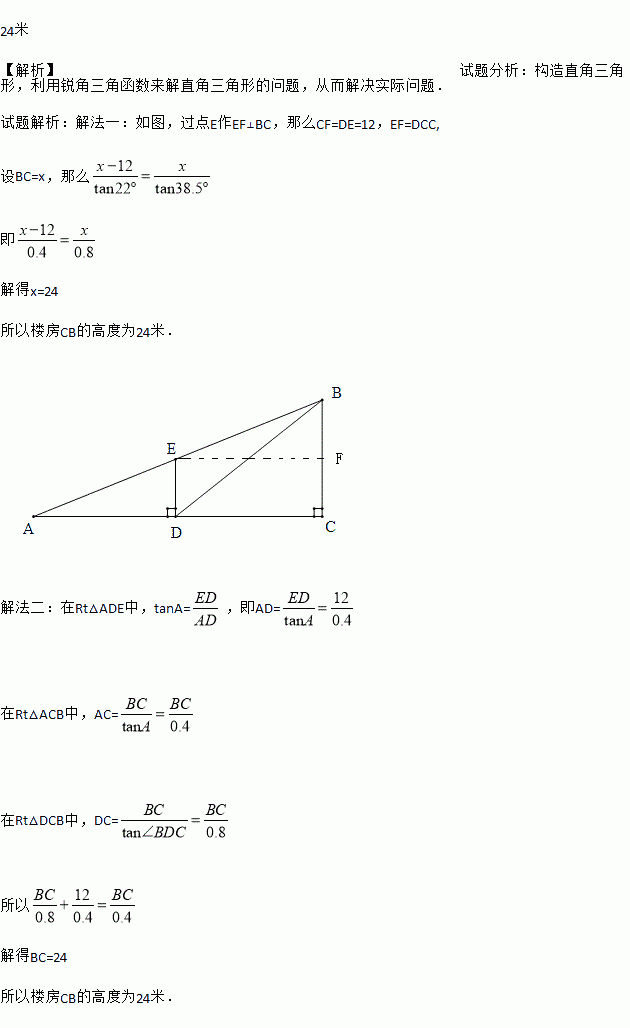 (本题满分6分)如图,观测点A、旗杆DE的底端D、某楼房CB的底端C三点在一条直线上,从点A处测得楼顶端B的仰角为22°,此时点E恰好在AB上,从点D处测得楼顶端B的仰角为38.5°.已知旗杆DE的高度为12米,试求楼房CB的高度.