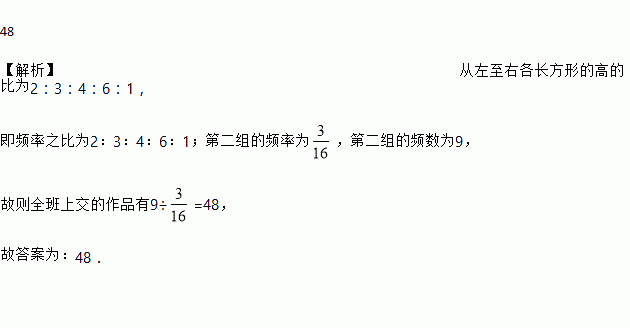 为迎接学校艺术节,七年级某班进行班级歌词征集活动,作品上交时间为星期一至星期五.班委会把同学们上交的作品件数按每天一组分组统计,绘制了频数分布直方图如下.已知从左至右各长方形的高的比为2∶3∶4∶6∶1,第二组的频数为9,则全班上交的作品有______件.