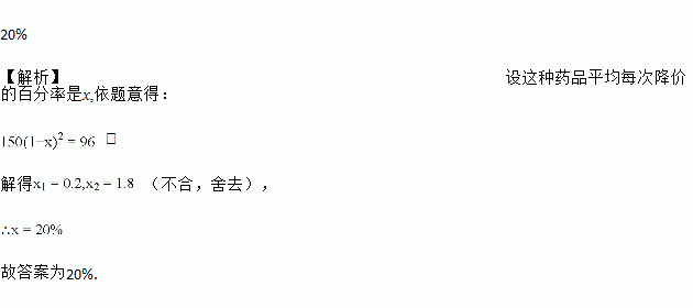 市政府为了解决市民看病难的问题,决定下调药品的价格.某种药品经过连续两次降价后,由每盒150元下调至96元,求这种药品平均每次降价的百分率是_____.