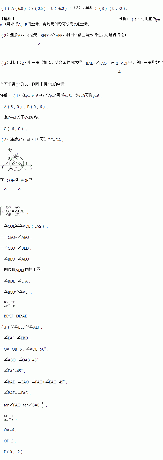 如图,在平面内直角坐标系中,直线y=-x+6分别于x轴、y轴交于A、B两点,点C与点A关于y轴对称,点E为线段OB上一动点(不与O、B重合),CE的延长线与AB交于点D,过A、D、E三点的圆与y轴交于点F