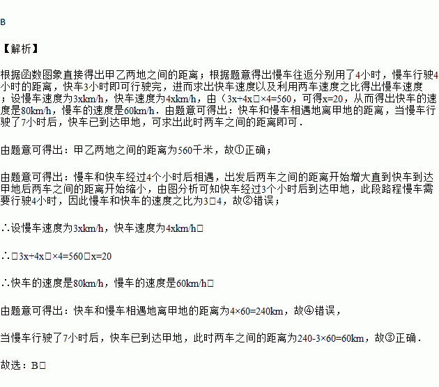 一辆慢车与一辆快车分别从甲、乙两地同时出发,匀速相向而行,两车在途中相遇后分别按原速同时驶往甲地,两车之间的距离s(km)与慢车行驶时间t(h)之间的函数图象如图所示,则下列说法中:①甲、乙两地之间的距离为560km;②快车速度是慢车速度的1.5倍;③快车到达甲地时,慢车距离甲地60km;④相遇时,快车距甲地320km;正确的是( )
