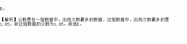 在某次体育测试中,九(1)班6位同学的立定跳远成绩(单位:m)分别为:1.71,1.85,1.85,1.95,2.10,2.31,则这组数据的众数是【 】