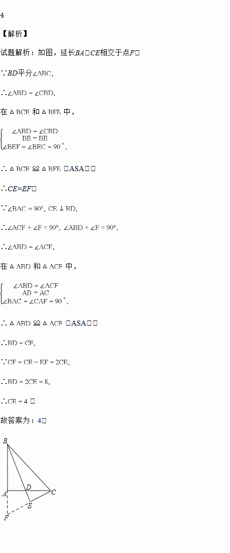 如图,在△ABC中,∠A=90°,AB=AC,∠ABC的平分线BD交AC于点D,CE⊥BD,交BD的延长线于点E,若BD=8,则CE=_________.