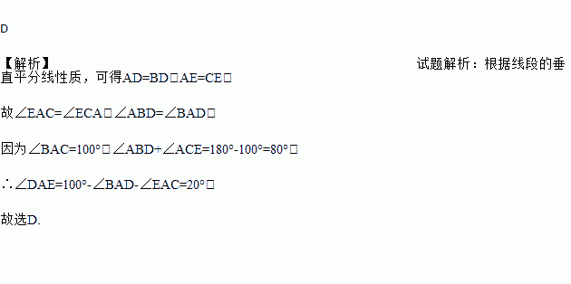 如图,△ABC中,∠BAC=100°,DF,EG分别是AB,AC的垂直平分线,则∠DAE等于( )