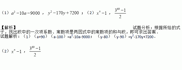 (1), ;(2), 【解析】试题分析:根据所给的式子,找出积中的一次项系数、常数项是两因式中的常数项的和与积,即可求出答案. 试题解析:(1)(a+90)(a-100)=a2-10a-9000;(y-80)(y-90)=y2-170y+7200. (2),