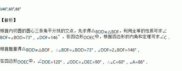 如图,⊙O为△ABC的内切圆,D、E、F为切点,∠DOB=73°,∠DOE=120°, 则∠DOF=_______度,∠C=______度,∠A=_______度.