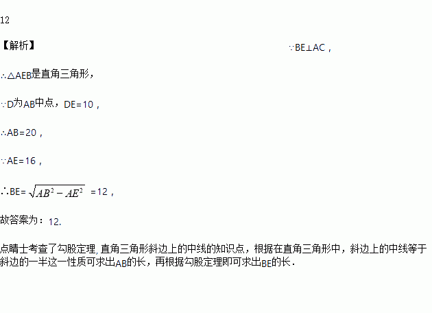 如图,△ABC中,D为AB中点,E在AC上,且BE⊥AC.若DE=10,AE=16,则BE= _。