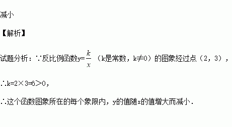 如果反比例函数y=(k是常数,k≠0)的图象经过点(2,3),那么在这个函数图象所在的每个象限内,y的值随x的值增大而 .(填“增大”或“减小”)