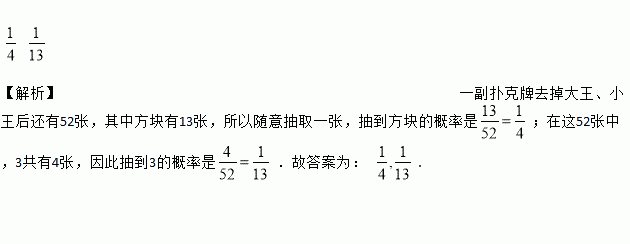 一副扑克牌去掉大王、小王后随意抽取一张,抽到方块的概率是______,抽到3的概率是______.