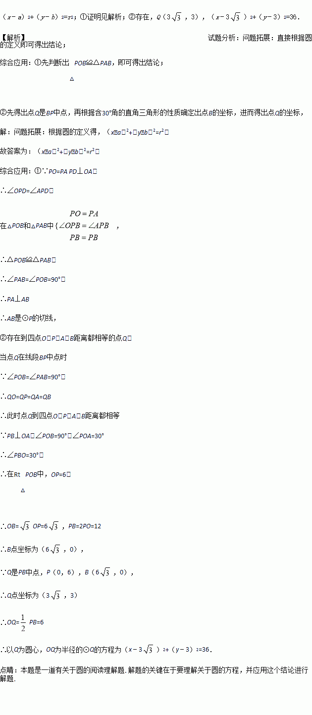 ②是否存在到四点O,P,A,B距离都相等的点Q?若存在,求Q点坐标,并写出以Q为圆心,以OQ为半径的⊙Q的方程;若不存在,说明理由.