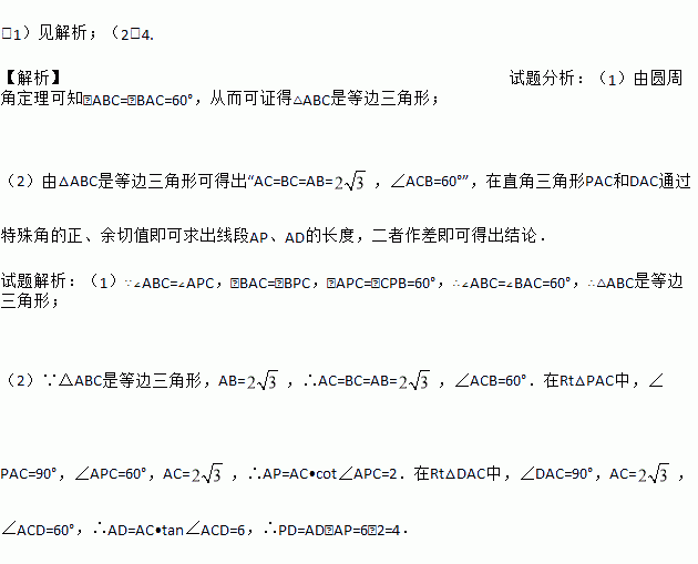 如图,A,P,B,C是圆上的四个点,∠APC=∠CPB=60°,AP,CB的延长线相交于点D.