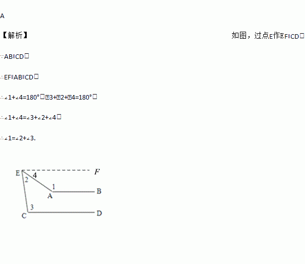 A 【解析】如图,过点E作EF∥CD, ∵AB∥CD, ∴EF∥AB∥CD, ∴∠1+∠4=180°,∠3+∠2+∠4=180°, ∴∠1+∠4=∠3+∠2+∠4, ∴∠1=∠2+∠3.