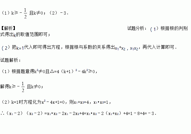 (1)k≥﹣且k≠0;(2)﹣3. 【解析】试题分析:(1)根据根的判别式得出k的取值范围即可; (2)把k=1代入即可得出方程,根据根与系数的关系得出x1+x2,x1x2,再代入计算即可. 试题解析: (1)根据题意得k2≠0且△=4(k+1)2﹣4k2≥0, 解得k≥﹣且k≠0; (2)k=1时方程化为x2﹣4x+1=0,则x1+x2=4,x1•x2=1, ...