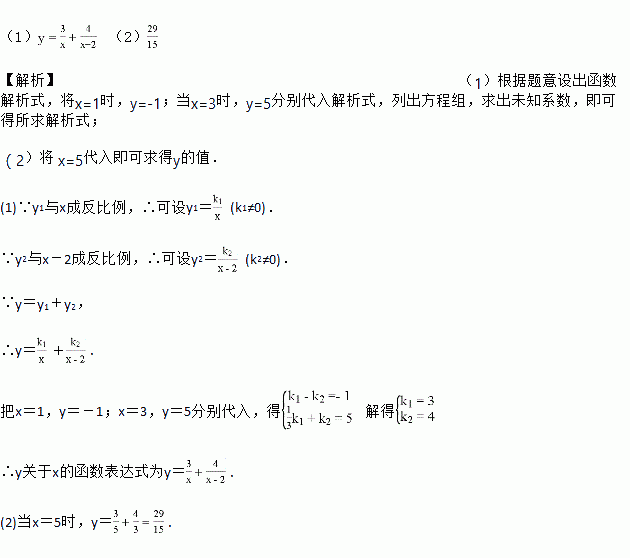 若y=y1+y2,且y1与x成反比例,y2与x-2成反比例,且当x=1时,y=-1;当x=3时,y=5.