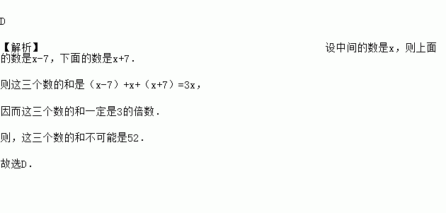 D 【解析】设中间的数是x,则上面的数是x-7,下面的数是x+7. 则这三个数的和是(x-7)+x+(x+7)=3x, 因而这三个数的和一定是3的倍数. 则,这三个数的和不可能是52. 故选D.