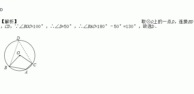 如图,A、B、C为⊙O上的任意三点,若∠BOC=100°,则∠BAC的度数为( )