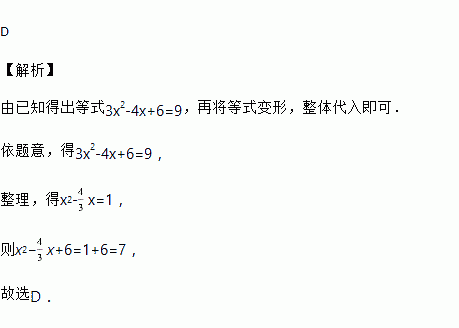 二次三项式3x2﹣4x+6的值为9,则x2-x+6的值为( )