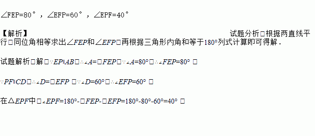 如图,EP∥AB,PF∥CD,∠A=80°,∠D=60°求∠FEP、∠EFP、∠EPF的度数.