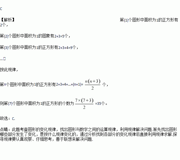 如图,下列图形都是由面积为1的正方形按一定的规律组成,其中,第(1)个图形中面积为1的正方形有2个,第(2)个图形中面积为1的正方形有5个,第(3)个图形中面积为1的正方形有9个,…,按此规律.则第(7)个图形中面积为1的正方形的个数