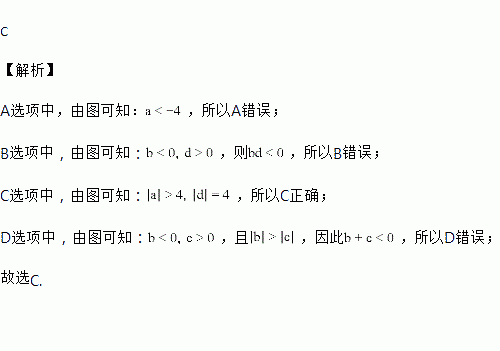 A. a>﹣4 B. bd>0 C. |a|>|b| D. b+c>0