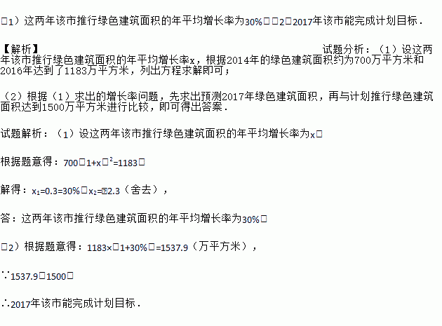 (2)2017年该市计划推行绿色建筑面积达到1500万平方米.如果2017年仍保持相同的年平均增长率,请你预测2017年该市能否完成计划目标?