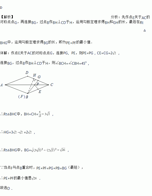 如图,菱形ABCD中,∠D=135°,AD=6,CE=,点P是线段AC上一点,点F是线段AB上一动点,则PE+PF的最小值是( )