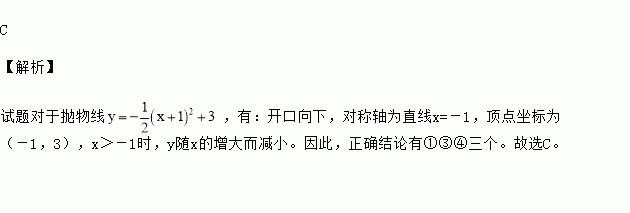 对于抛物线,下列结论:①抛物线的开口向下;②对称轴为直线x=1;③顶点坐标为(-1,3);④x>1时,y随x的增大而减小,其中正确结论的个数为