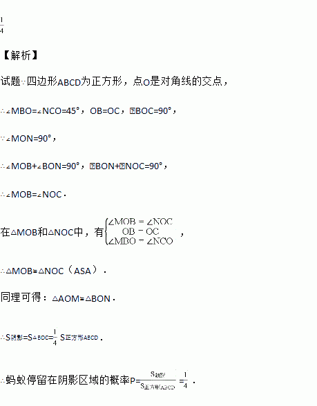 如图,一只蚂蚁在正方形ABCD区域内爬行,点O是对角线的交点,∠MON=90°,OM,ON分别交线段AB,BC于M,N两点,则蚂蚁停留在阴影区域的概率为_____.