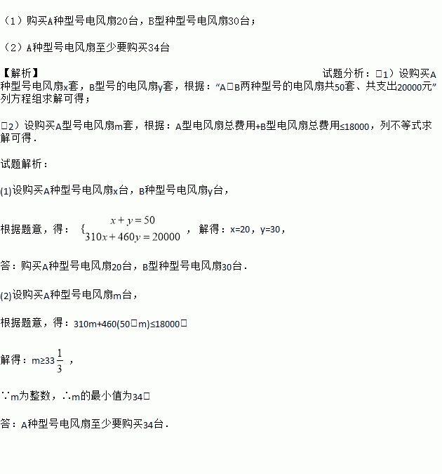 (2)若购买A,B两种型号的电风扇共50台,且支出不超过18000元,求A种型号电风扇至少要购买多少台?