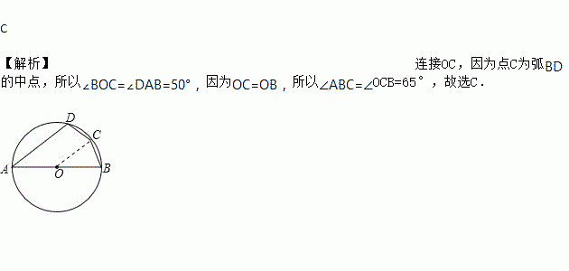如图,四边形ABCD内接于⊙O,AB为⊙O的直径,点C为弧BD的中点,若∠DAB=50°,则∠ABC的大小是( )