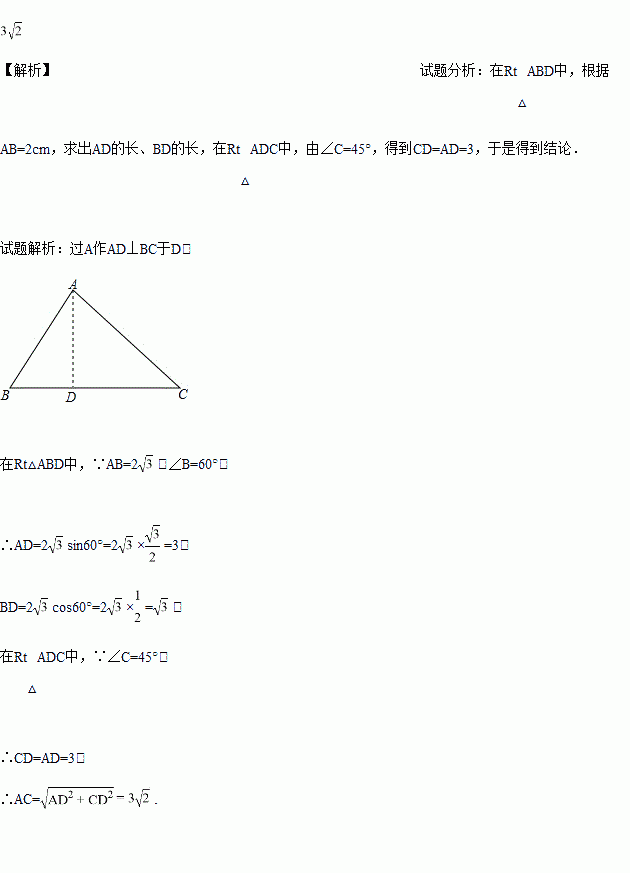 如图,△ABC中,∠B=60°,∠C=45°,AB=2,求AC的长。