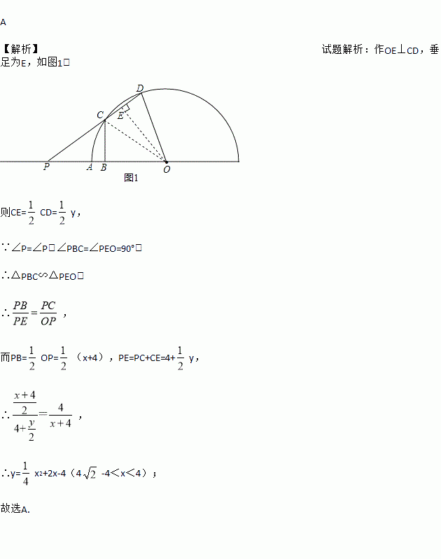 如图,半圆O的半径OA=4,P是OA延长线上一点,线段OP的垂直平分线分别交OP、半圆O于B、C两点,射线PC交半圆O于点D.设PA=x,CD=y,则能表示y与x的函数关系的图象是( )