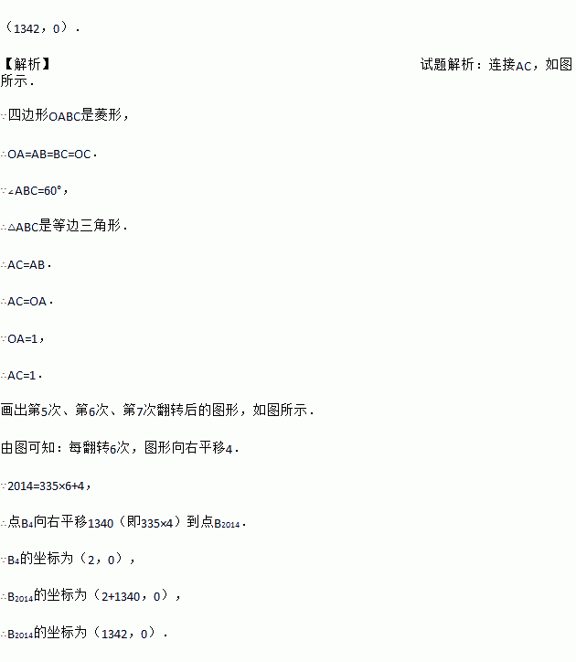如图,在坐标系中放置一菱形OABC,已知∠ABC=60°,OA=1.先将菱形OABC沿x轴的正方向无滑动翻转,每次翻转60°,连续翻转2014次,点B的落点依次为B1,B2,B3,…,则B2014的坐标为 .
