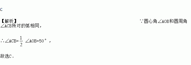 C 【解析】∵圆心角∠AOB和圆周角∠ACB所对的弧相同, ∴∠ACB=∠AOB=50°, 故选C.